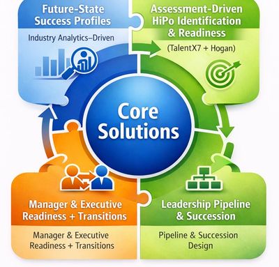 Identify high-potential talent with confidence using objective assessments and clear readiness standards tied to your Future-State Success Profiles. We are certified assessment practitioners and collaborate with tools like Talentx7, Hogan, StrengthFinder, and Talent Q to produce defensible HiPo slates, Ready Now/Ready Soon calls, and targeted acceleration plans that turn potential into promotion-ready performance.